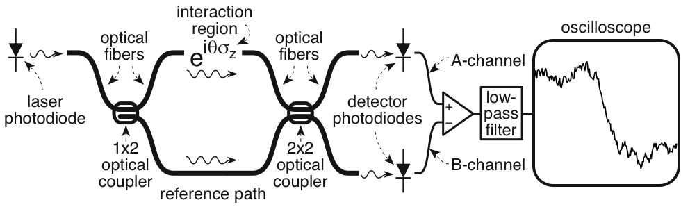 In this simulated experiment, the spin is detected, and also affected, by illuminating it with a beam of light: a stream of photons from a laser photodiode. Each photon interacts with the spin probabilistically. The spin may impart some phase shift to the photon, and the photon may change the state of the spin. The magnitude of the phase shift theta indicates the strength of this interaction. It is usual to describe this effect by the relaxation time constant T1, where a shorter time constant indicates a stronger interaction. The optical fibers and couplers are adjusted such that after the interaction, the photon is detected by a detector photodiode either at the A-channel or B-channel, depending on its phase shift. The time series of detector events constitutes the data of the simulated experiment. In a typical experiment, individual photon detections are not recorded; instead, the instruments behave as a low-pass filter whose output (displayed on an oscilloscope, for example) is similar to the proportion of photons at A calculated by this simulation. (This simulation uses far fewer photons and a much shorter time constant than a typical experiment.)